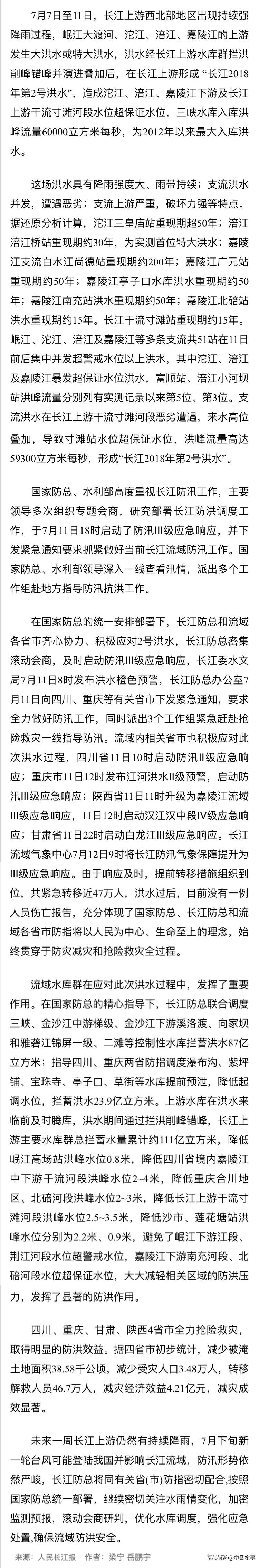 7月17日8时,长江流域仅有两站超警戒水位,三峡水库入库流量39000立方米每秒,出库流量维持42000立方米每秒,长江2号洪水平稳通过三峡库区,水库入库流量呈退水趋势,这标志着长江2018年第2号洪水带来的影响趋于结束。长江防总在国家防总的精心指导下,和流域相关省市一道,再次成功应对了今年长江第二场洪水,此次长江上游区域性较大洪水未造成人员伤亡,取得了显著的减灾效益。