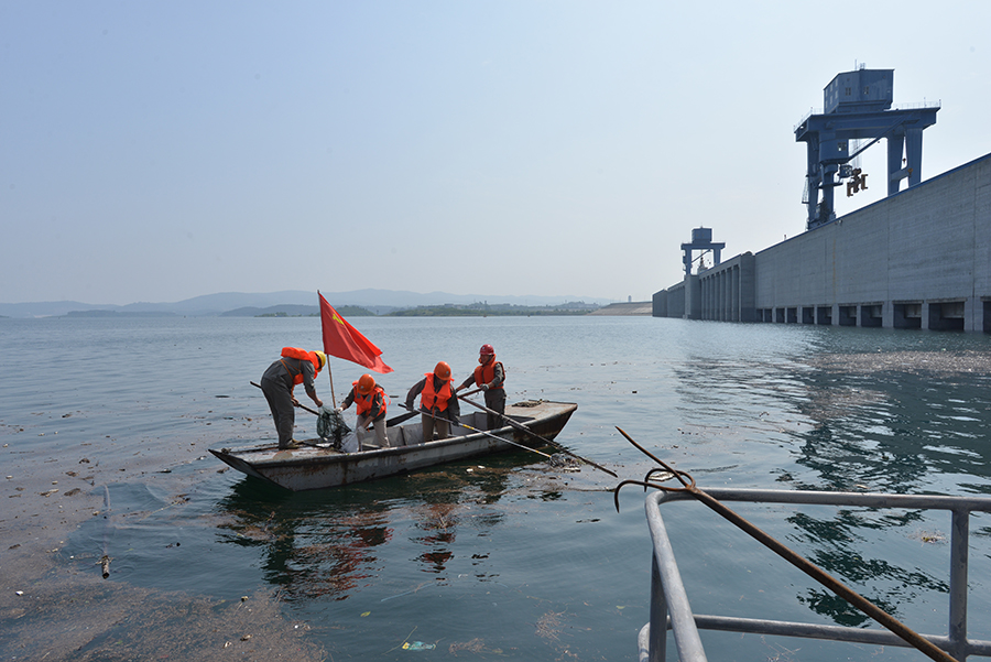 6月16日,汉江集团电厂紧急组织30余名职工,驾驶清漂船,身着救生衣,手拿长长的竹竿舀勺,逐片打捞漂浮垃圾,以保证库区航运和水环境安全。