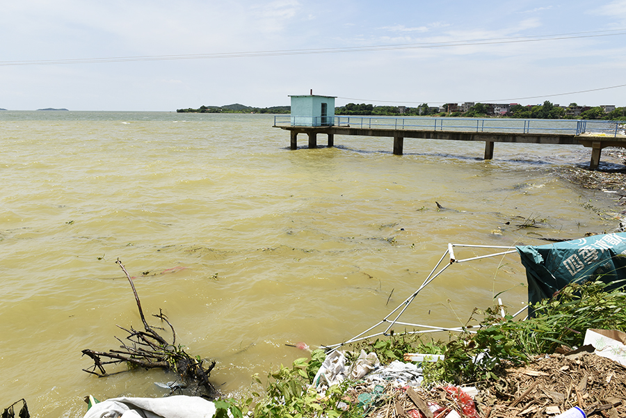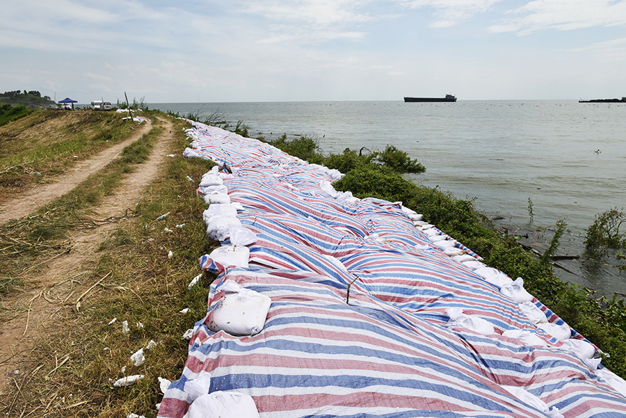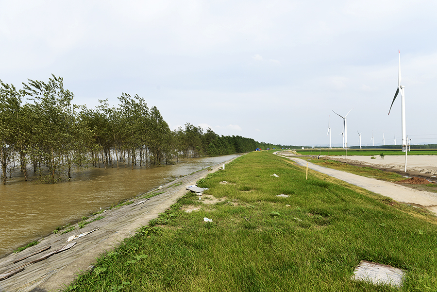 九江市都昌县鄱阳湖区周溪圩堤,圩堤内外水位落差达8米,湖水汹涌地拍打着圩堤