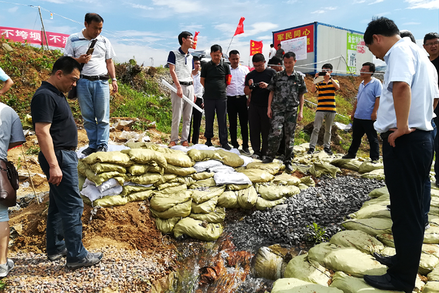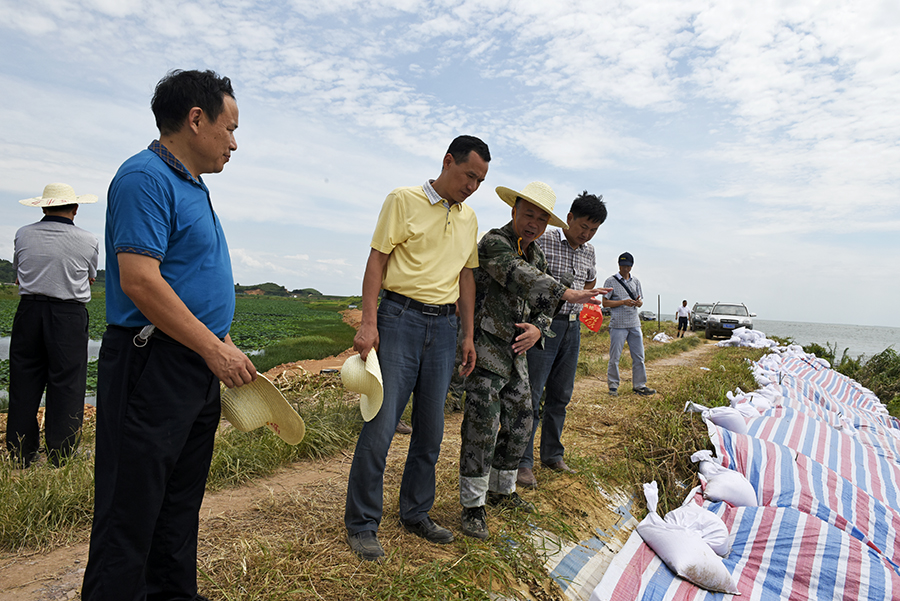 7月7日,国家防总江西工作第二小组查看九江市都昌县鄱阳湖区枭阳圩堤段险情处理情况