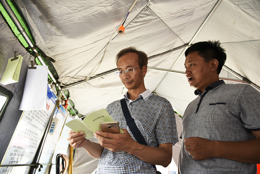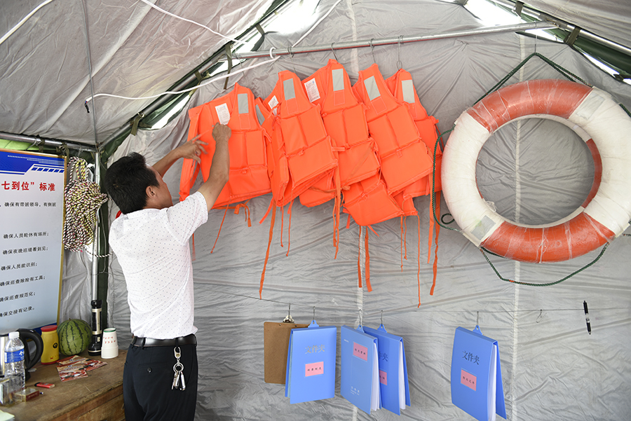 7月6日,湖口县南北港沿湖大坝的值守人员正在检查防汛物资