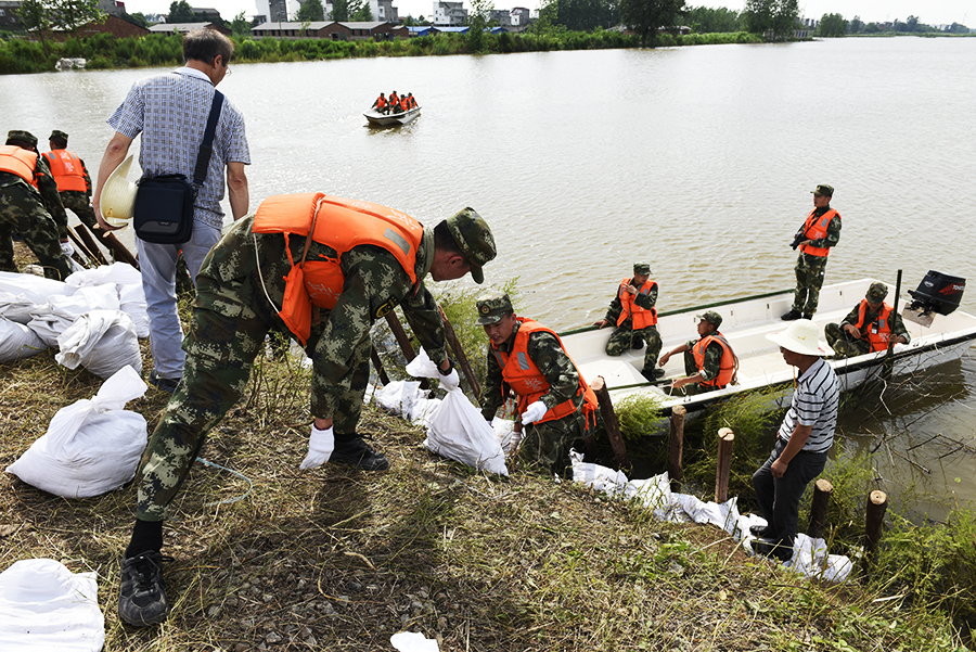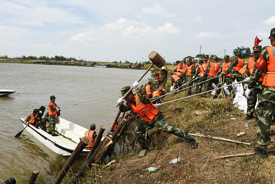 7月6日,九江市九江县江新洲大堤一处内湖出现湖坡垮塌,武警部队正在采用打桩、袋装土填筑固脚处理险情