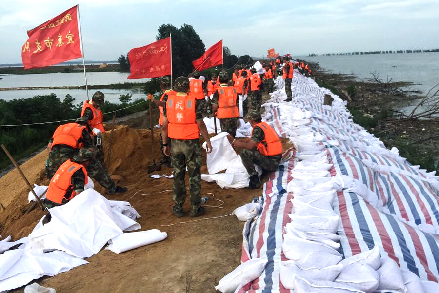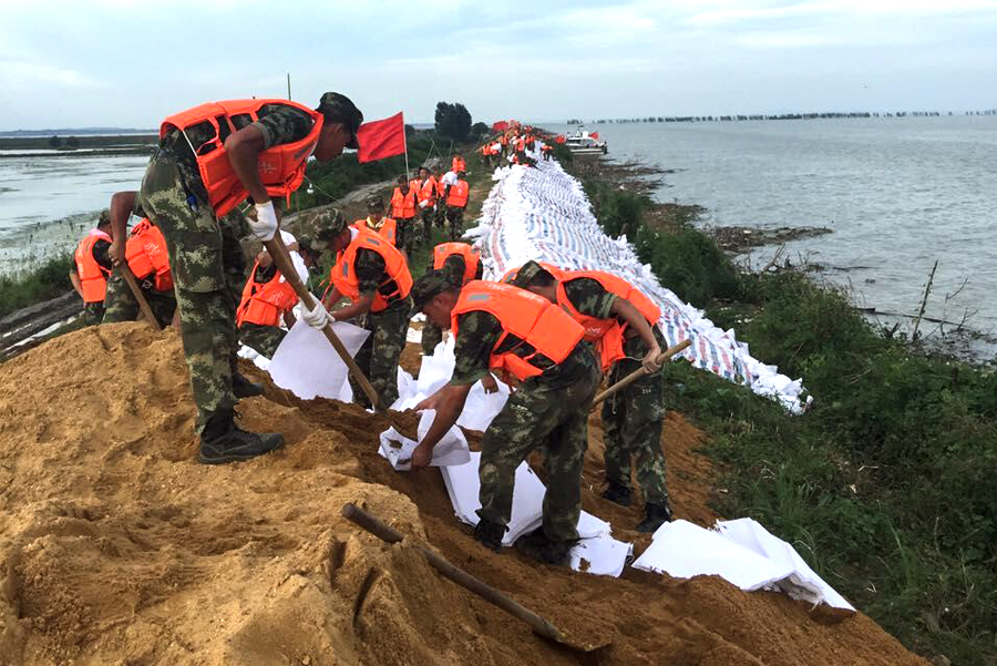7月6日,九江市永修县浆滩联圩,160名武警提前采用彩条布护坡,并用砂袋加固