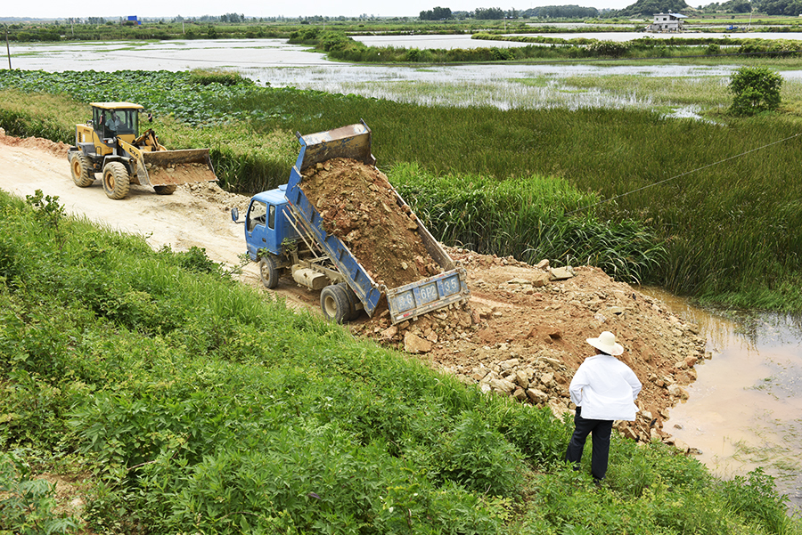 7月7日,九江市都昌县鄱阳湖区东风联圩珠光段的堤身较为单薄,正在对堤身进行加固处理