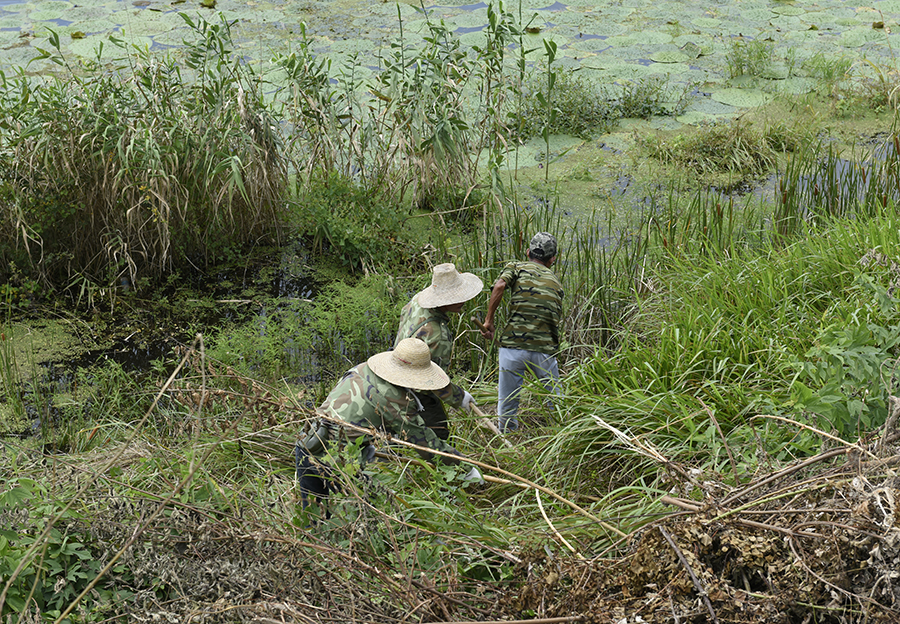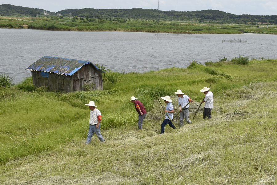 7月7日,九江市都昌县鄱阳湖区东风联圩珠光段,当地群众正在清理内堤一侧杂草,便于及时发现险情