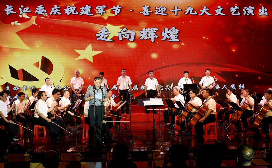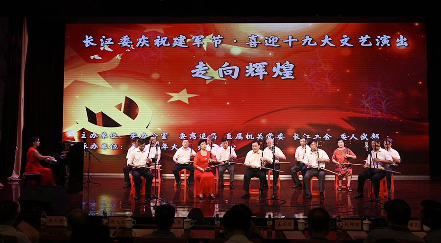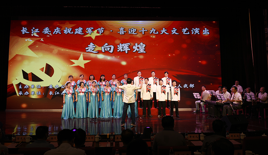 今年是中国人民解放军建军90周年。7月28日下午,在“八一”建军节即将到来之际,长江委举办“喜迎十九大,庆祝建军节,走向辉煌”文艺演出,缅怀人民军队走过的90年光辉历程,喜迎党的十九大胜利召开。长江委党组副书记、副主任熊铁致辞并观看演出,委党组成员、副主任胡甲均,长江工会主席郭玉观看演出。