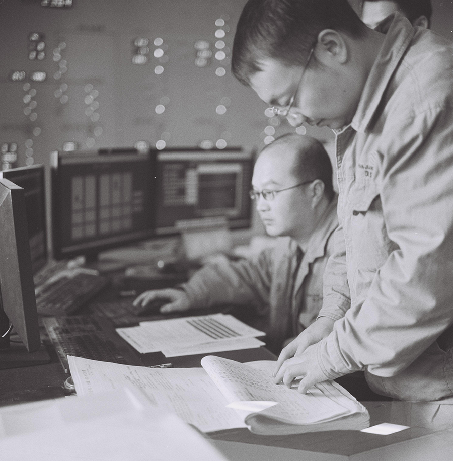 图为发电分场运行值长交接工作,仔细阅读值班记录,做好工作交接制