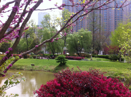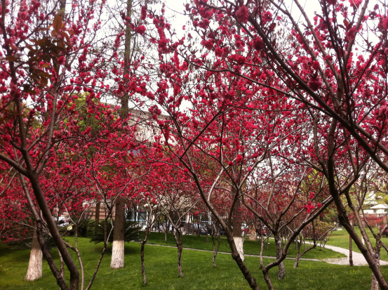 阳春三月,大院处处姹紫嫣红,花团锦簇,尽展满园春色。新大门右侧的白玉兰、紫玉兰争相斗艳,左侧风姿各异的红碧桃、白碧桃竞相绽放。更让人惊喜的是,会议中心前方、红楼附近的一大片樱花林,美艳斑斓,灿若云霞,让你如醉如痴,恍惚之间,你会以为自己游走在武汉大学樱花大道或者东湖的樱花园,诗王白居易的“小园新种红樱树,闲绕花枝便当游”不由脱口而出。到了四月,大院中心“小桥流水”附近的杜鹃花开始盛开,娇艳的“映山红”绚丽无比。晴时满园花开,雨天如沐甘露,春雨说来就来,连绵的、柔和的,滋润着大院,抚摸着大院里的一草一木,给大院带来灵动和浪漫,透亮与清爽。我喜欢沐浴着如丝的春雨,漫步在院内的石板小径上,一边欣赏美景,一边呼吸着春的芬芳,感受着春跳动的脉搏。多么充满活力的春季呀!春天使大院焕然一新,春天带给我们欢乐和希望,催促我们奋发向上。