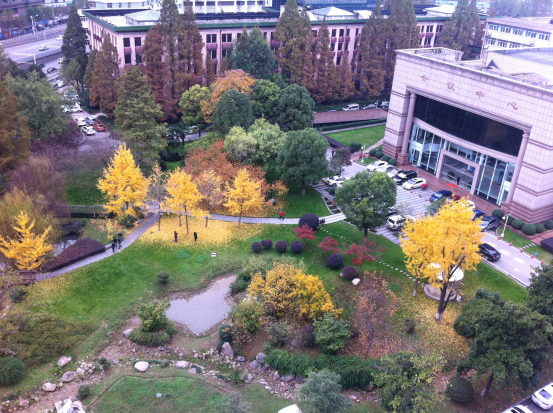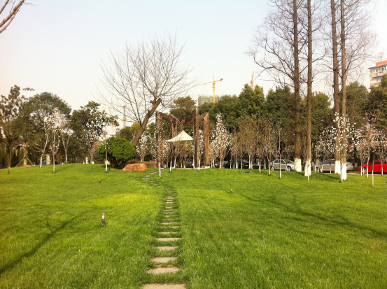如果要说院中最令人流连忘返的区域,莫过于防汛科技大楼、会议中心、红楼、新大门之间的中心绿化广场,如同一个小小的“袖珍型”湿地公园。我喜欢沿着广场石板小路缓缓散步,这已成为我工余饭后一种美美的享受。工间操时间,我会站在防汛科技大楼10楼的窗前,俯视着大院全貌,望着这个五彩的世界,体会着什么叫心旷神怡。听机关服务中心主任徐彰讲,大院中心广场是一个“微缩版”的长江流域图。广场中心的确有一条蜿蜒盘旋的人工小溪流,我尽量发挥自己的想象力,似乎找到了“长江第一弯”、“洞庭湖”、“鄱阳湖”,但由于是“枯水”期,始终没有辨别出哪里是长江头,哪里是长江尾。